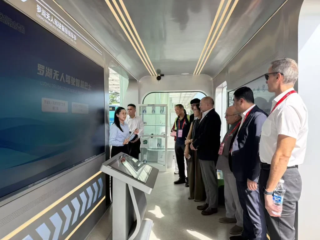 In Shenzhen, the delegation visited Shenzhen Bus Group and WeRide to experience the city’s cutting-edge autonomous bus service. Shenzhen’s B888 Route, a Level 4 autonomous bus line, connects the Luohu Port border crossing to the MixC Mall. Equipped with over 20 advanced sensors, including lidar and high-definition cameras for 360-degree perception, these buses operate safely under the supervision of onboard safety personnel. The IRF delegation also learned about another pilot in the Qianhai District, where 20 self-driving minibuses operate across four routes, demonstrating how automation is enhancing daily urban mobility.